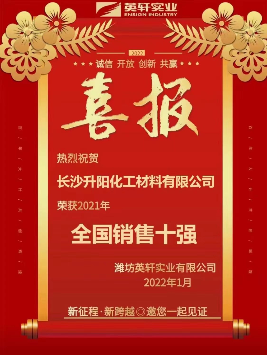 我司继2021年荣获该产品全国销售十强,今年继续获此殊荣,是认可,更是一种激励。未来,升阳化工将继续用更高的标准要求自己,用更饱满的热情服务好每一位客户。
